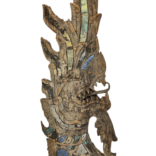 Thai 19th Century Carved Wood Temple Dragon with Blue, Teal and Gold Accents