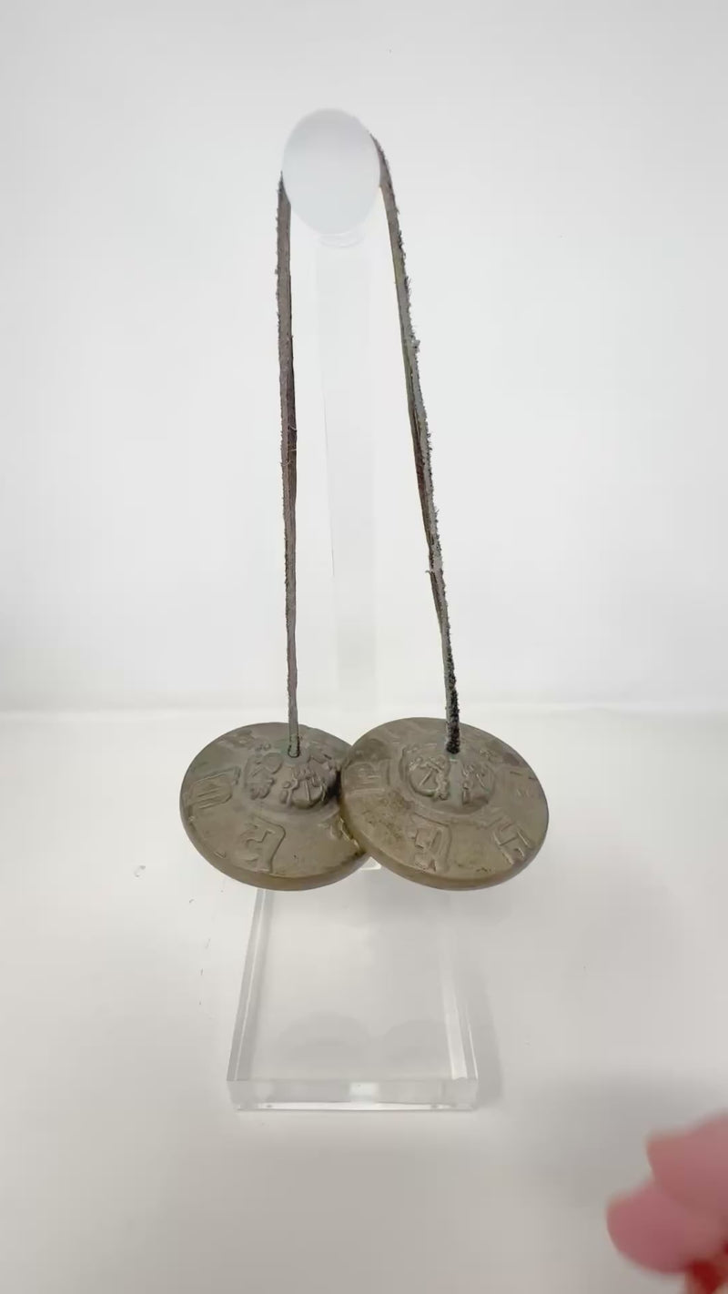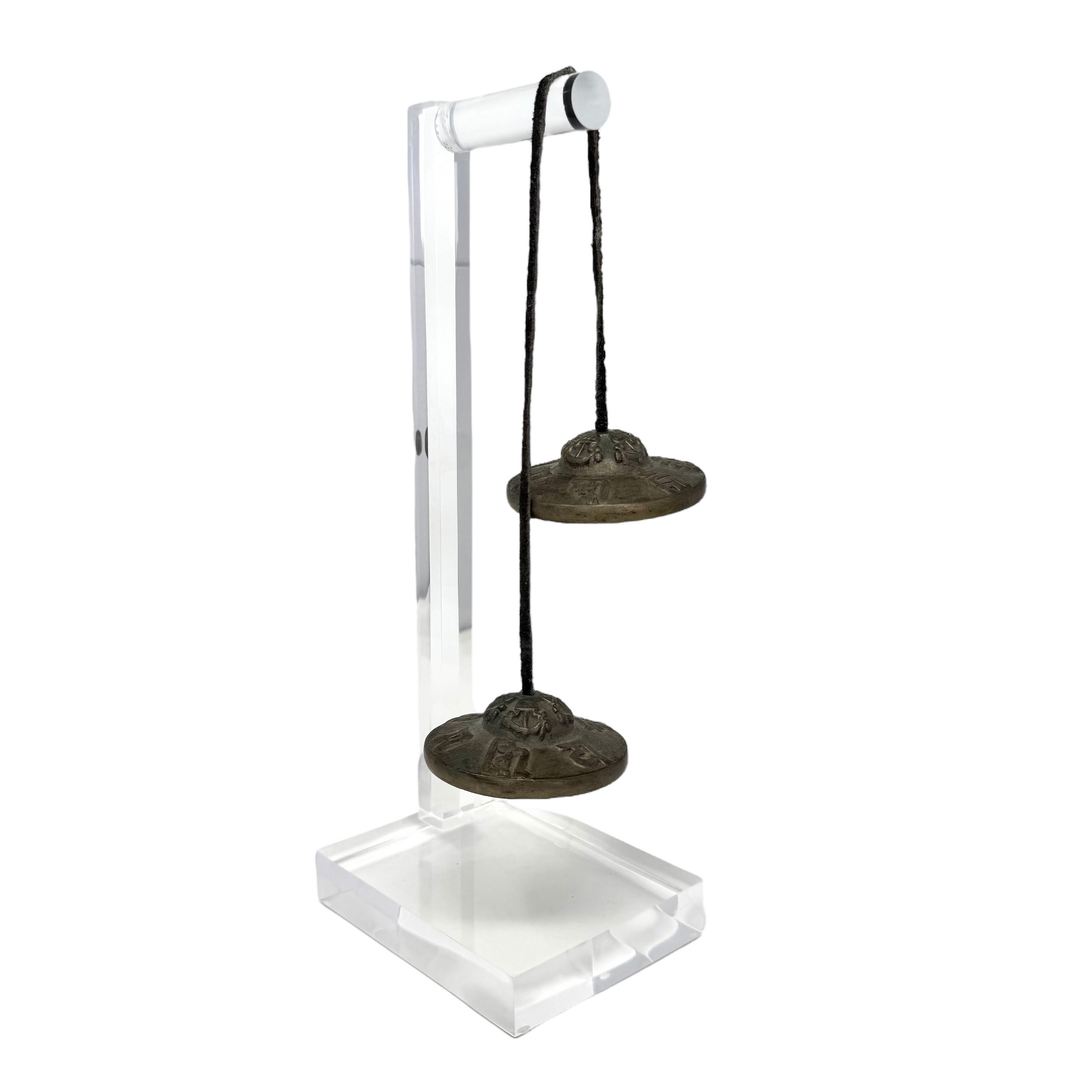 The two cymbals are constructed of bronze both cast with crossed 'dorije' to the center and with Sanskrit text to the rim. They are joined together with a leather strap, produce a unique long ringing tone, and are presented on a custom new acrylic stand for display.